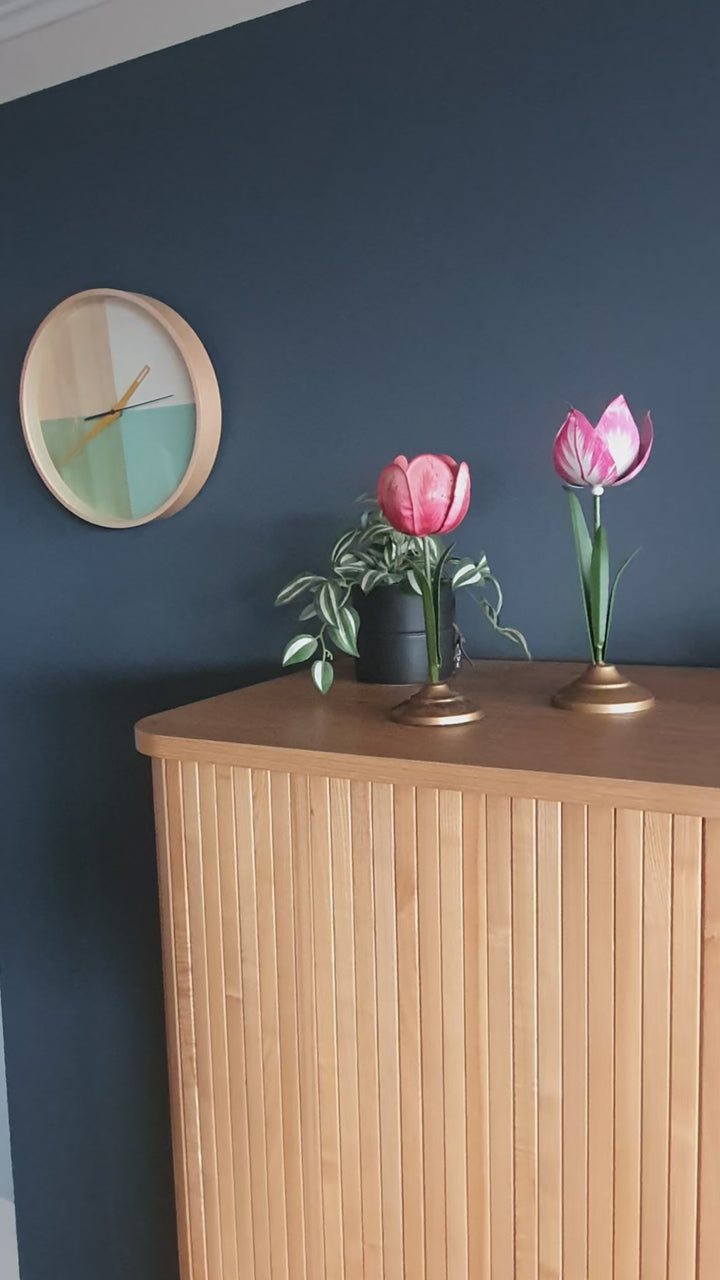Dale vida a tu hogar con este colorido set de dos candelabros en forma de tulipán rosado.